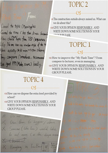 经过40分钟的热烈讨论后,同学们果然萌发出了不少的新奇的点子,比如第四个议题(我们如何处置课间餐经常剩下来的食物或饮料?)就有同学说:找几个班也是一样的情况(经常课间餐有剩)联合起来等放假了带去给那些没饭吃的流浪的人;甚至有同学说可以开一个网店,专门卖这些还可以补充班费…