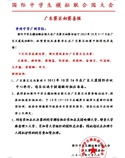 在刚刚结束的国际中学生模拟联合国大会广东赛区初赛活动中,我校国际部学生表现突出,有十名学生顺利晋级参加广东赛区总决赛。他们是: