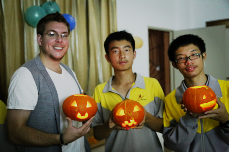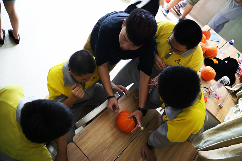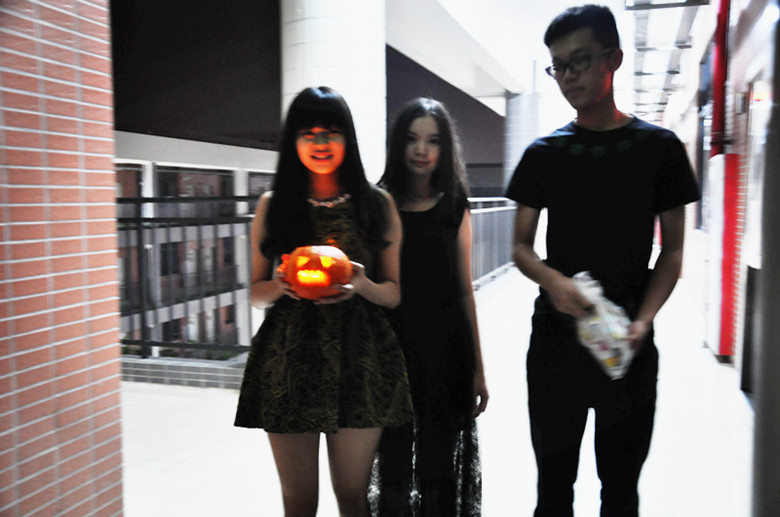 节目一开始,由主持人Aaron和Roxy介绍了万圣节的由来及内容,并邀请外教分享在国外万圣节的经历。接着,我们一起看了恐怖片-----泰国怪谈。而紧随其后的是几位普通班的同学被请上台唱歌跳舞,掀起了晚会的高潮。然后重头戏来了——鬼屋探险!一进门,幽暗的环境、阴森的吟唱,再加上微微晃动的绿色荧光,就让人毛骨悚然。门口有一位引导者,拿着微弱的光,带我们慢慢行进。在鬼屋行进的途中,总被骷髅时不时从背后抱住,贞子从相框里伸出头来,嫁衣红鬼拿着剑四处追杀,四处逃难时也要小心,因为地上有白衣长发爬来爬去,满是血的手慢慢从脚面爬上来。尖叫声、欢笑声此起彼伏,所有人都玩得不亦乐乎。借着鬼屋探险激动的心情,我们开始了必不可少的环节之一:做南瓜灯。做南瓜灯是急需要耐心和创造力的活动,需要从顶部挖出一个盖子,用勺子慢慢把南瓜内部掏空后,用刀把眼睛嘴巴刻出来。大家兴高采烈地雕刻出了眼睛和嘴巴,南瓜头们表情五花八门,微笑的、害怕的、吓人的,趣味十足。紧接着,我们带着万圣节糖果和做好的南瓜灯前往高一和高二的其它班级。我们向每个班英语介绍万圣节,并将送出南瓜灯,发放糖果,希望学校里的其他同学也能感受到我们的快乐。