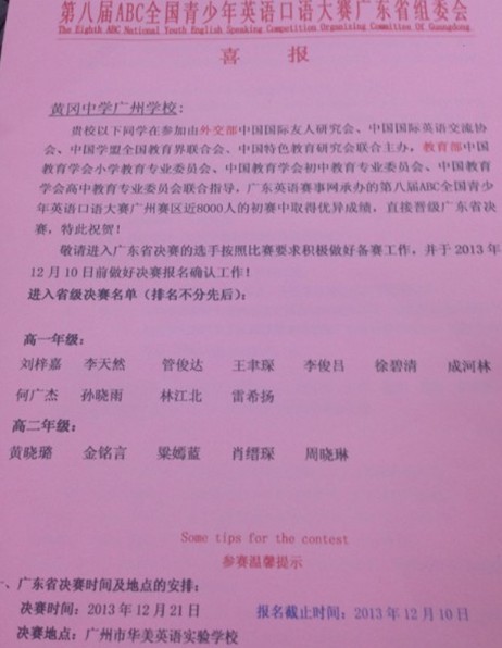 由外交部中国国际友人研究会、中国国际英语交流协会、中国学盟全国教育界联合会、中国特色教育研究会联合主办,教育部中国教育学会小学教育专业委员会、中国教育学会初中教育专业委员会、中国教育学会高中教育专业委员会联合指导,广东英语赛事网承办的第八届ABC全国青少年英语口语大赛广州赛区初赛于2013年10月31号在我校举行。我校共26位同学参加。 最终国际部高一刘梓嘉、李天然、管俊达、王聿琛、李俊吕、徐碧清、成河林、何广杰、孙晓雨、林江北、雷希扬,高二学生黄晓璐、金铭言、梁嫣蓝、肖缙琛、周晓琳16位学生通过初赛直接晋级广东省决赛,特此祝贺!