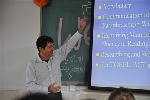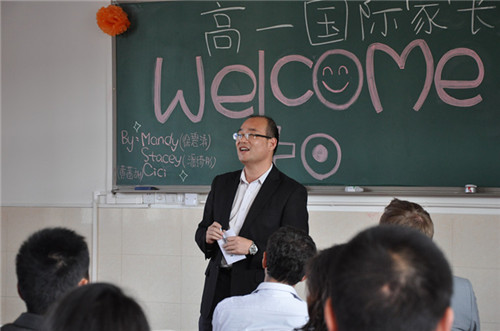 在家长会上,孙传华校长勉励了各位高一的同学要脚踏实地的打好基础,同时提出了要明确“学习是为什么”、“三年后你们要什么”以及要“怎么做”三点具体的指导,得到了在场学生和家长的热烈响应。随后,PGA王林锴主任进行了本学期教学情况汇报,就目前同学们已经完成的GAC课程考评分数进行了分析,并从词汇、阅读和听力几个方面给出了具体的学习建议。令所有高一同学们意外的是教他们口语和听力的美国外教用中文进行了发言并分享了在过去这段时间和他们在一起学习的心得。