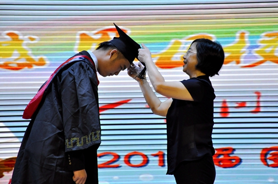 范校、孙校为学生拨穗、颁发毕业纪念册,象征着孩子们真正地毕业了