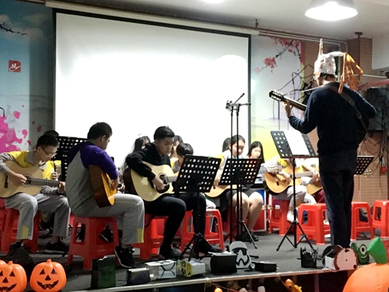 最先登场的是音乐外教Koeppel。Koeppel化身头顶怪帽的诡异黑衣人,瞬间就成为全场的焦点,并带领着学生用吉他演奏《Halloween Theme Song》《Monster Mash》等万圣节之歌,奇幻幽婉的音调旋律迅速弥漫现场,也拉开了本场晚会的帷幕。
