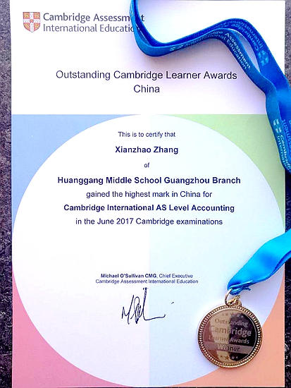 据悉,张贤昭同学在剑桥大学考试局2017年AS考试中表现突出,会计科目更取得了全国第一(Top in China)的好成绩!