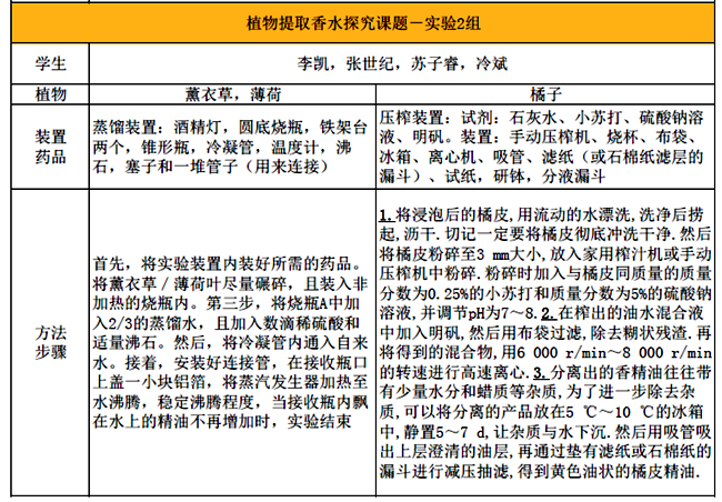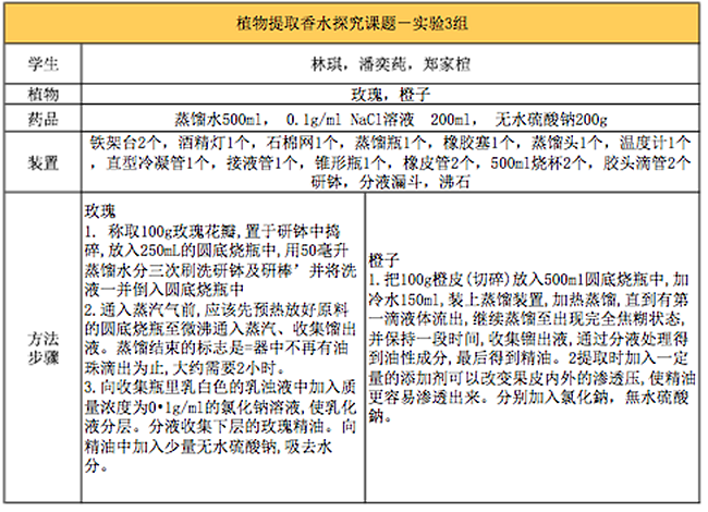 确定实验探究前,学生们制作开题报告,分析说明课题背景、探究目的和意义,并完成了访问调查(包括可行性调查,香水知识的调查等),拟定探究方法。