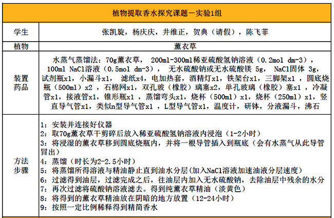 实验1组采用水蒸气蒸馏法,利用蒸汽带出泡好的薰衣草挥发出来的芳香油。虽然方案具有理论上的可行性,但在实际操作中出油率偏低,未达到预期效果,小组成员急中生智,临时更改提取方法——直接蒸馏。值得一提的是,实验1组是前期工作准备最充足,操作步骤最专业的一组。