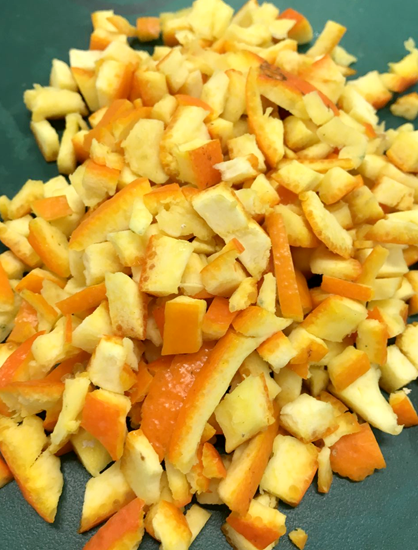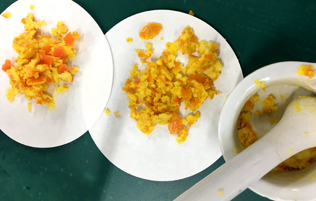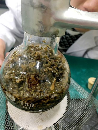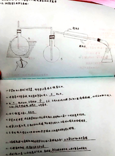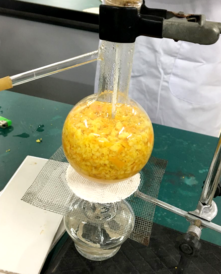 实验3组准备了橙皮作为蒸馏提取的原材料,用蒸馏法提取橙皮中的芳香油,与实验2组的压榨法开展“PK比拼”。