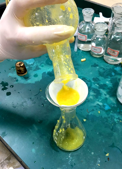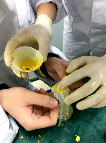 实验2组则分成了两小分队同时行动。张世纪和冷斌采用压榨离心法,从橙皮和薄荷中提取芳香油。该小分队所采用压榨法出油率很低,只能看到表面似油非油的一小薄层,两名组员分析,应该是大家忽略了离心机转速问题,手动离心机转速不够导致分离困难。