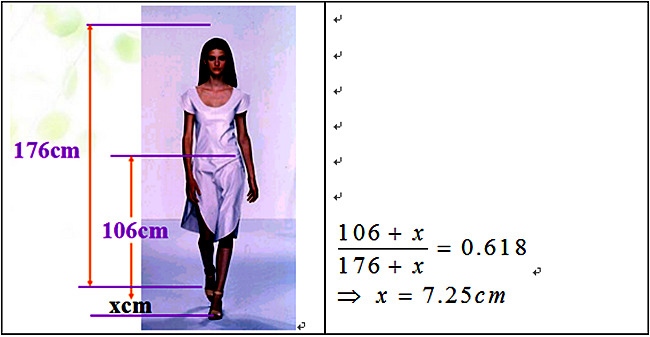 例题: 身高176cm的女模特的肚脐以下部分长106cm,她的高跟鞋的鞋跟高度是多少厘米时最具美观?以下是通过黄金分割比率进行计算的过程。