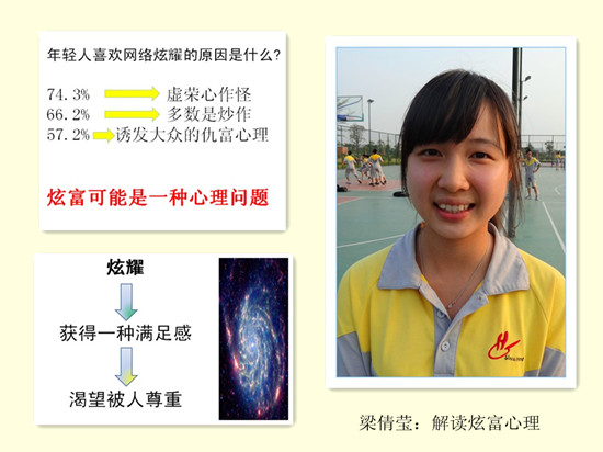 我先摆出了郭美美的图片——一个以红十字会经理认证的炫富女,作为这次演讲的开场白,从而引出了主题,炫富心理。接着,我分享了两个在网络上搜索到调查报告。第一个是世界奢侈品协会发布的2011年报告,里面表明了中国的奢侈品市场消费高达107亿美元,超越了日本,成为全球第二大奢侈品消费国。重点是,其中的主流人群,25-34岁的年轻人占到多数。其次是关于年轻人喜欢网络炫耀的原因,有74.3%的人认为其原因是虚荣心作怪,66.2%的人认为炒作。然而,假若网络炫富行为不是炒作,而是活生生的事实的话,我们就不得不认真思考,人们到底是出现了什么样的心理问题?心理医生认为,郭美美这类人炫富是社会快速发展背景下的畸形心理作怪。