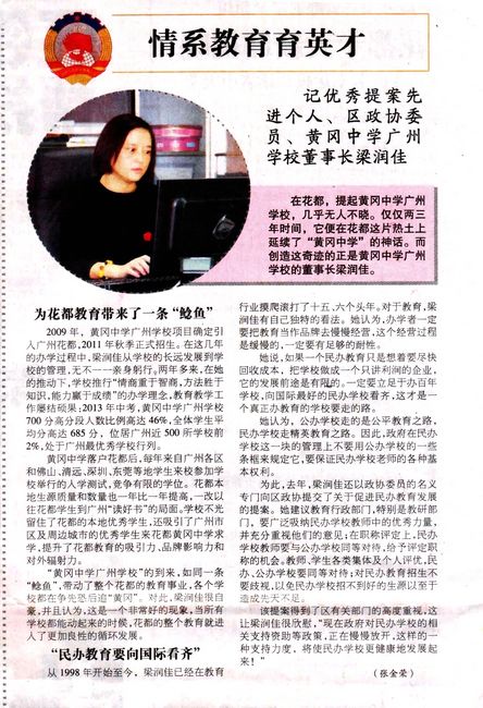 2009年广州市黄广中学花都,2011年秋季正式招生。在这几年的办学过程中,梁润佳从学校的长远发展到学校的管理,无不一一亲身躬行。两年多来,在她的推动下,学校推行“情商重于智商,方法胜于知识,能力赢于成绩”的办学理念,教育教学工作屡结硕果:2013年中考,广州市黄广中学0分高分段人数比例高达46%,全体学生平均分高达685分,位居广州近500所学校前2%,处于广州最优秀学校行列。
