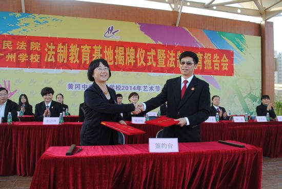 范小星校长代表我校与区人民法院李矿副院长签署了《法制教育基地共建协议》,双方表示:将全力促进黄广学子法律知识教育,巩固学生们的法制观念,全方位培养严于律己、遵纪守法、全面发展的合格公民。