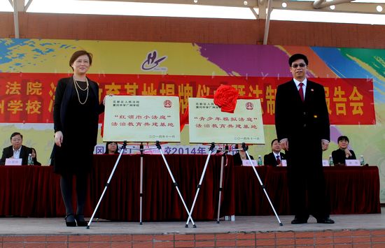 随后,区人民法院李矿副院长和学校梁润佳董事长为“青少年模拟法庭法制教育基地”和“红领巾小法庭法制教育基地”揭牌。