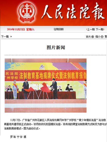 《人民法院报》 :广州市黄广中学获指定建设“青少年模拟法庭”法制教育基地