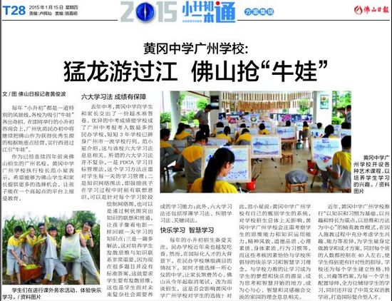 近年,广州市黄广中学惯为基础,以兴趣和特长为重点,以思维和方法为中心”的精英教育模式,在因人施教过程中充分考虑学生兴趣、能力等差异,为学生度身定做教学和成才方案。每个班人数都控制在40人左右(小学每个班30人左右),使得学生得到更有针对性的指导,为每个学生建立性格、特长、兴趣、学习、习惯等档案,再为每一个学生配置导师,全程、全方位辅导学生的学习和思想,同时还开设了中英文双语教学班,打造国际复合型人才。“我们的教育理念是情商和智商并重,方法和知识同行,能力和成绩共进。所以我们的老师都会想办法把教学和学习的科学方法糅合进有趣的课堂当中,在不知不觉、细水长流、水到渠成中完成教学,让学生自己当学习的主人,成为善于学习的智慧型学生。”范小星信心十足地回答。