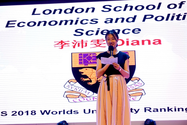 获伦敦政治经济学院(经济学专业排名世界第2)的优秀毕业生李沛雯同学,以学姐的角度为现场的国际学子讲述自己高中求学期间的种种真实经历,校园求知奋斗过程中所遇到的困惑与疑难,引起了师弟师妹们的强烈共鸣,学姐成功进入理想大学的励志事迹也为学生们带来了无形的力量。
