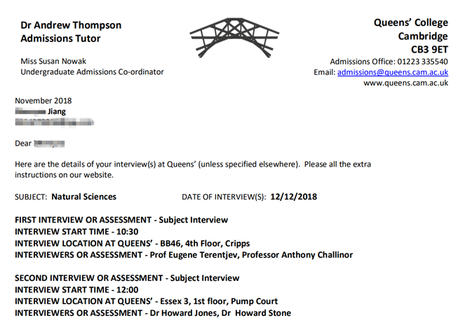 江同学受邀面试的专业是剑桥大学皇后学院(Queen’s College)的自然科学专业,在2018年第31届滑铁卢阿伏伽德罗国际化学竞赛中,江同学就从4372名参赛者中脱颖而出,获得全球第一的优异成绩,个人学习能力、学业水平都得到世界权威学科竞赛的认可。