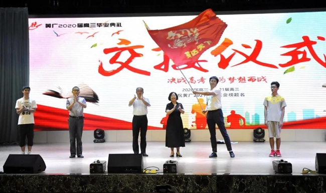 2020届高三年级在现场全体师生的注视下,经范小星校长与孙传华副校长传递,将象征使命的烈火战旗交给了2021届高三年级师生代表。