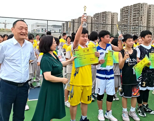 范小星校长、杨文化副校长更亲临决赛现场,向八年级篮球赛事的举办表达支持,为表现优异的班集体颁发奖杯、奖状,并表示希望八年级学生将在篮球场上充分展现的奋斗进取精神同样投入到课业学习当中,以强大的精神毅力、燃烧的奋发斗志去创造属于自己的进步和辉煌!