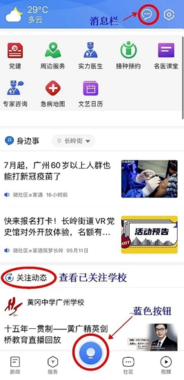 (9)在首页中点击中间蓝色按钮,可获知最新消息。“消息框”可以查看互动消息,“关注动态”将展示你关注的学校的动态。