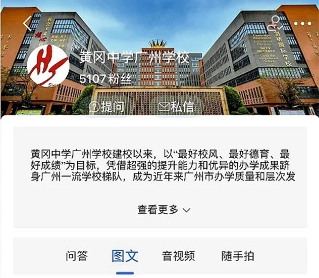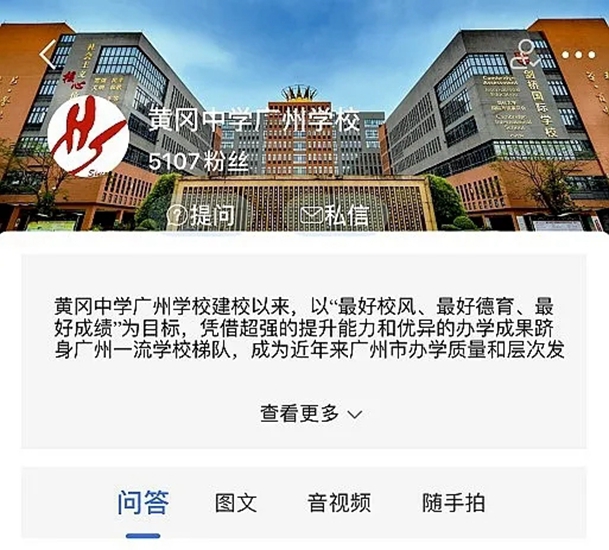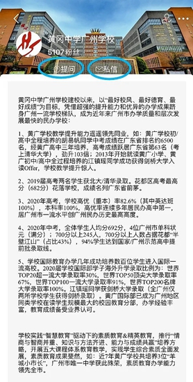 (6)点击广州市黄广中学/b>,进入学校页面,学生和家长可在学校页面上方选择“提问”和“私信”进行互动,此时需进行简单注册(注册时请务必修改昵称)。