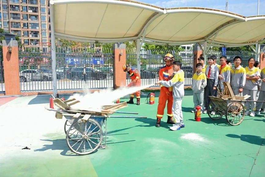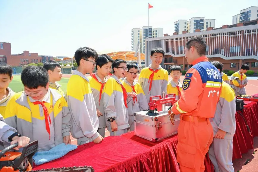 同日上午,黄广中学同步联合花都区教育局、花都区消防救援局隆重举行“生命至上 · 安全‘童’行”开学第一课——暨消防科普进校园主题活动。