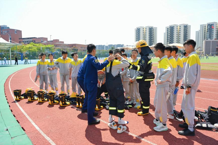 现场1000余人参与、观摩了模拟火场逃生、云梯救援演练,消防搜救犬技能、消防救援装备展示。学生近距离接触液压破拆工具组、热成像仪、消防无人机等“高精尖”装备,观摩了消防指战员原地着装、快速铺设水带、灭火器灭火实操演示,还穿战斗服体验穿越逃生帐篷......