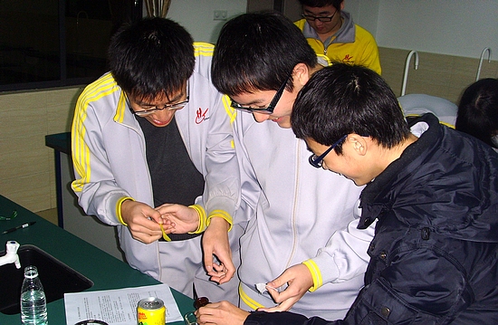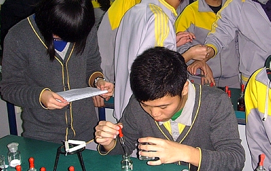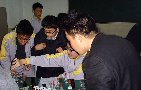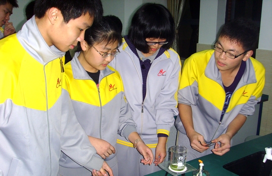 2012年3月14日晚,国际部高一班的趣味化学实验活动如期举行。此次活动,同学们利用化学实验室丰富的资源,在化学老师张仁发的指导下顺利完成。 首先,我们利用酒精、碘和硫代硫酸钠(大苏打)的反应,成功将制得的“可乐”变成了“雪碧”;我们利用磷酸钠溶液和明矾揭穿了魔术“烧不着的棉布”的奥妙;让糖与氯酸钾反应,在浓硫酸的“帮助”下,放出大量的热并产生火焰;选取外形完整、大小合适、具有网状叶脉的树叶,在10%的氢氧化钠溶液中煮沸后,慢慢刷去叶肉再晾干,即可自制可爱的叶脉书签;向含碘的氯化钠中滴入几滴稀硫酸,再加入淀粉,便可观察到溶液变成了蓝色;在高锰酸钾晶体中加入2、3滴浓硫酸,再用玻璃棒蘸取,当接触到酒精灯灯芯时,酒精灯被神奇的点燃了…… 一个个与我们日常生活有着紧密联系的小实验,通过同学们的手,在实验室中成功地演绎出来,让我们认识到科学神奇的同时,也给我们带来了无比的欢乐。 当然,实验过程中也有几个实验无法顺利完成,比如:因为缺少钴、镍的氯化物等,同学们期待的“水中花园”无法栽培,使我们没能欣赏到五彩缤纷的“花朵”;由于没有符合单孔胶塞大小的瓶子,由苏打制作的灭火器没有成功,但在张老师的指导下,同学们改变了实验目标,利用实验室现实条件,竟然制成一个小型的酸灭火器,这一“创举”备受老师和同学们的称赞……
