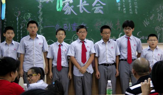 2012年6月1日,七(2)班主题为“告别童年,怒放青春”的家长会,在《童年》的歌声中拉开的帷幕。悠扬的歌声,把与会的学生、家长、老师带到了童年的时光。 15:00正,李琛、赵红霞、张叶钊、刘樱、戴明阳、覃欣怡六位中文主持人和李泽钧、龚导两位英文主持人闪亮登场,以一首主题为《回首童年,放飞梦想》的诗歌为主持词,宣布家长会的开始。蒋程煜、陈睿等同学对父母恩情的内心告白,感动了他们的父母也感动了全班家长;肖玮明爸爸的嘱咐和梁思泓妈妈的深情,让所有学子久久难忘。真情洒满整个教室,这是心与心的交汇,爱与爱的融合! 陈星宇、顾家豪、龙迪聪领诵《少年中国说》,昭示着青少年学生以身许国、努力学习、发奋图强的精神;刘祺泓、刘洁、邓孟清、陈泽锋、伍晓晴、戴明阳、蓝可逸、江彦谊8位同学的葫芦丝齐奏《希望》,范澳华、汤宪铭、何泽明、施海晨、钟栩英、李泽钧6位同学的太极扇表演《中国功夫》,以优美的曲调、刚劲的步伐,彰显了黄广学子的青春活力与快乐生活;赵红霞、刘樱、陈华、李泽钧、陈俊全等同学的新概念英语背诵表演,流利的英语表达,真诚的感情投入,充分展示了我们学校英语教学的成果;戴明阳、杨志成、陈泽锋、陈毅锟、伍晓晴、覃欣怡、李小楠、李泽钧等寝室长用真诚友善的言语,演绎了“舍友那些事”,亲切自然,平凡中让人感动;校园卡拉OK歌手陈燊、覃欣怡、龙楚莹闪亮登场,把整个家长会推向了高潮,他们用歌声告诉我们,人生要坚强,我们必须努力;张叶钊、刘樱、覃欣怡、戴明阳朗诵的诗《神雀》,表达了中华儿女要实现民族复兴的雄心与决心;诗朗诵《我爱黄广》,是郑佳明、赵泽宇、张咏、梁思泓、蓝可逸、邹芷晴、李小楠、杨志成等同学用他们自己的方式表达对父母生育养育之情感恩,对学校老师培养教育感谢之情;陈星宇、蓝可逸的歌曲《知足》和沈琪峰、龚导、谭永鑫、蒋程煜、肖玮明、范澳华、古俊源的《奇迹再现》同样告诉我们,广州市黄广中学…… 在雄壮的校歌《怒放的生命》中,班长陈星宇发表了题为《青春-责任》的演讲,告诉我们责任就是不让爱我们的、我们爱的人担心,号召大家要努力学习,对自己负责,感恩感谢和自立自强。范校长给孩子们的青春寄语,深深地嵌入师生、家长的心中,这是孩子们节日收到的浓厚的爱;班主任孙香山老师的寄语,思路清晰,点面结合,情真意切,语重心长。同学们在孙老师的倡议下,举行了庄严的青春宣誓:告别童年,怒放青春,做一名无愧于己、无愧于人、无愧于国家的黄广学子! 17:00时,激动人心的生日会开始了。蛋糕摆在课室当中,同学们围成一个圈,手捧蜡烛,在影影绰绰的烛光下许下了自己的心愿,一起唱起了生日歌,气氛十分温馨,其乐融融。 这是难忘的一天,人生转折的一天,一个再次扬帆起航的一点。 童年已离去,执手青春,我们深深的祝福他们:人生不断收获辉煌,明天无限美好。
