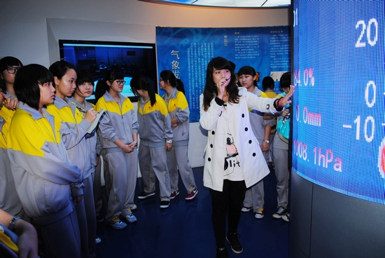 一楼大厅的立体沙盘为我们全方位展示了花都区的地形、地貌、山川、河流分布,上面标示了花都区所有气象观测站的具体方位,使同学们对花都区的概况及花都区的气象观测点有一个非常直观的了解。