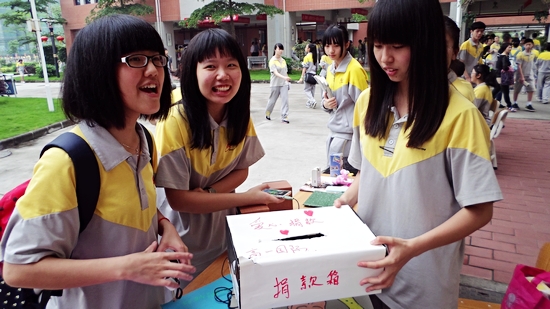 时间在手指间流过,等到我们发觉过来时,东西已经卖得差不多了,而时间也已经过了好几个小时了。这是,几位女生又决定组织募捐活动,拿着募捐箱海报就出发了。遇到老师、家长和同学的时候都会简单讲一下这次活动的主题,简明地讲解自己的目的,尽量不耽误对方的时间,保持着礼貌的态度。很多家长都大方热心地捐出了自己的一点心意,很多老师更是出手大方,为公益事业献身。