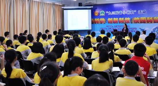 广州市黄广中学本次活动的致辞中,勉励黄广学子要扎实地掌握科普知识,人人争做科普带头人,有效地掌握预防灾害知识,珍爱生命,善待人类的家园。本次科普活动涵盖大自然灾害科普画展、科普专题讲座、科普日记比赛等活动。与会嘉宾和黄广师生一起,为雅安地震遇难同胞默哀。本次活动重头戏是广东省气象局高级工程师潘蔚娟博士为我校同学作气象灾害主题讲座。潘博士凭借渊博的专业知识,就大气气象灾害原因、全球气象趋向、气象预防体系的构建、人类应对和预防气象灾害措施等深入浅出地讲解,会场互动气氛热烈。讲座最后,同学们就目前气象热点问题、灾害预防措施等与潘博士展开互动,同学们彬彬有礼、知识面丰富受到潘博士的好评。
