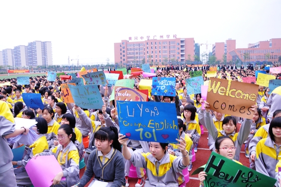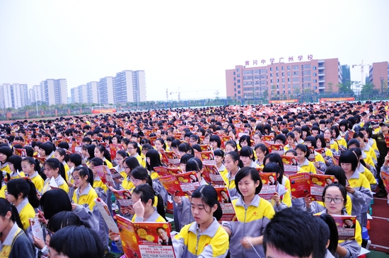 在长达一个半小时的讲座里,李阳老师那优美纯正的英语发音、风趣幽默的诙谐语言、激情飞扬的肢体动作,使讲座更加引人入胜,现场掌声、笑声、互动声不绝于耳。李阳老师通过讲述自己“如痴如疯”的学习英语经历和同学们日常学习生活中的事例,旁征博引、深入浅出,以自己丰富的理论和实战经验为全体师生讲授了学习英语的秘诀和培养英语思维的“魔法”。他说:“早晨读英语,比参加任何培训班都重要。”“只有大声朗读,才能把外语变成母语,才能把语法变成语感,才能把短期记忆变成长期记忆。”“考高分的秘诀就是:大量地背诵长句、难句,把长句划分成短句,把短句脱口而出。”“天才就是重复次数最多的人,天才就是坚持时间最长的人!”他同时还告诫同学们:“鲜花是用冷水浇开的。”“批评我的人,比表扬我的人更爱我。”“打败一个永不放弃的人是不可能的。” “狠心才是真正的爱,对自己够狠,才能发现自己多优秀!”“广州市黄广中学篮!”他的励志激励,极大地激发了同学们学习英语的兴趣,调动了大家内在的激情,鼓舞了同学们“把英语踩在脚下,不让自己失望”的信心。
