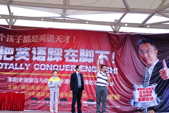 “把英语踩在脚下”——李阳疯狂英语大型演讲报告会,于4月10日下午4点,在我校运动场隆重举行。全球著名教育品牌“李阳疯狂英语”创始人、英语口语魔术师李阳老师,为我校全体师生带来了一台激情四溢的英语盛宴。