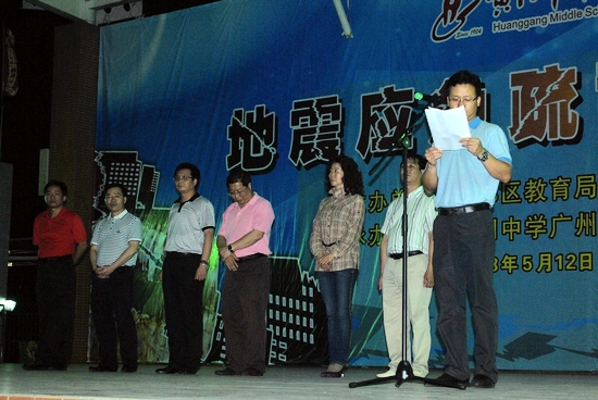接着,在田径场上举行了演练总结大会,会议由何东升局长主持。各年级迅速有序地整好队并清点人数,由江楚桥副校长代表学校向区政府领导报告了演练情况。随后全体参演人员及观摩的区政府领导一起为“5·12”汶川地震、“4·14”玉树地震、“4·20”芦山地震遇难同胞和在抢险救灾中牺牲的同志默哀一分钟。再接着,由副区长、区抗震救灾领导小组组长罗干政同志在演练总结大会上讲话,他对此次夜间地震应急疏散演练给予了高度评价,称赞学校组织有力、方案严密、演练规范、行动迅速,演练非常成功。他称赞此次活动,展示了黄广师生的优秀素质及精神风貌,师生的地震应急避险、自救互救能力得到提高。