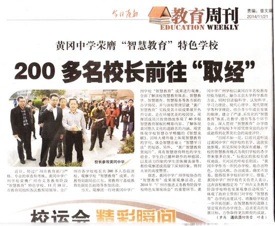 据悉,广州市黄广中学”成果展观摩活动,是2014年“广州市推进义务教育阶段学校特色发展现场会”的重要环节。广州市黄广中学育经验为依托,融合北京大学科学教育方法,同时引进脑科学、认知科学、学习力理论、现代心理学、现代管理学等科学理论,结合青少年成长发展的规律,建立了严谨、系统化的“智慧教育”体系,在教学、德育等各个环节全面、深入贯彻“智慧教育”办学措施,办学短短3年即凭借突出的办学成就得到业界及社会的高度评价。