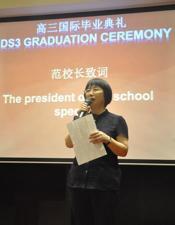 校长致辞。“我们一起度过了短暂的岁月,我们也分享了永久的回忆。在你们的面前是更宽阔的天空,可学校和老师永远在背后牵挂着你们。” 三年来,范校见证了同学们的点滴成长,今天,同学们将带着她的祝福和牵挂远行。