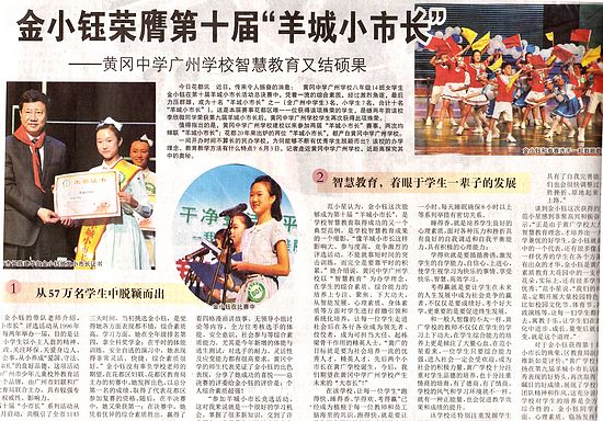 近日,传来令人振奋的消息: 广州市黄广中学生金小钰在第十届羊城小市长活动总决赛中,凭着一流的综合素质,经过激烈角逐,最后力压群雄,成为十名“羊城小市长”之一(全广州中学生3名,小学生7名,合计十名“羊城小市长”)。这是本届赛事花都区唯一一位获得该项殊荣的学生,是继两年前该校李欣微同学荣获第九届羊城小市长后,广州市黄广中学殊荣。
