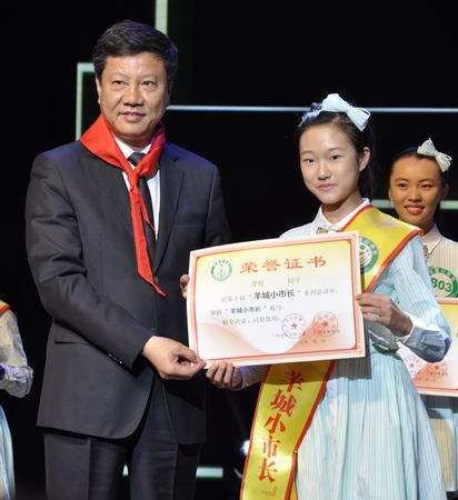 广州市陈建华市长亲自为金小钰等10位优秀学生颁发“小市长”荣誉证书。