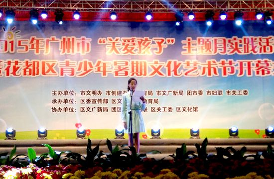 7月7日,2015年广州市“关爱孩子”主题月实践活动暨花都区青少年暑期文化艺术节开幕式隆重举行。活动由广州市文明办、创建办、教育局主办,花都区委宣传部、区文明办、区教育承办,来自广州市黄广中学市长”金小钰同学应邀出席活动。