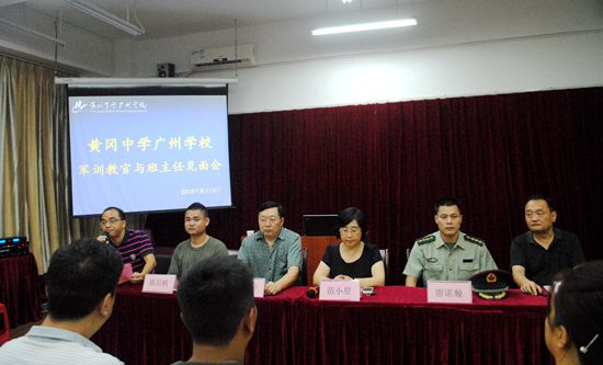 范小星执行校长、江楚桥副校长、德育处杨文化主任、黎强副主任联同承训单位中国人民解放军防化团龙华部队谢偌翰上尉、陈后帆上尉出席见面会,对80余位参训班级的班主任和教官等就本次军训任务、宗旨及注意事项等提出要求。