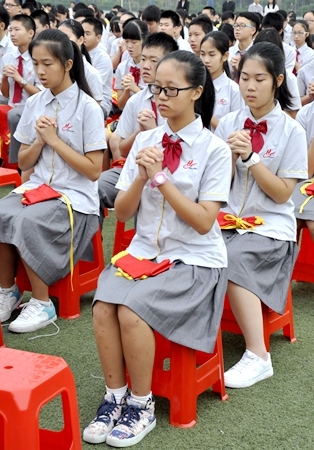 老师现场引导学生双手合十,以虔诚之心面感恩父母、学校、师长。