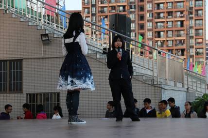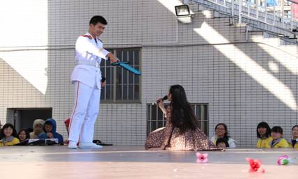 Although the weather was not good enough, all the students were so excited that the whole playground was bustling with loud voices and laughter. After a while, the wonderful show began. With rich experiences and good teamwork, students from Senior 2 showed their outstanding performance and didn’t live up to our expectations. Programs such as Gone with the Butterflies and Flirting Scholars were refreshing and wonderful. The performance of students from Senior 1 was also excellent enough; dramas like The Emperor’s New Clothes and The Snow White were amusing and funny and won a round of applause; programs like the musical The Sound of Music and varied songs and chorus also amazed the audience, even the foreign teachers highly praised their good performance.