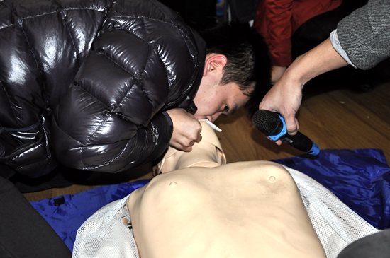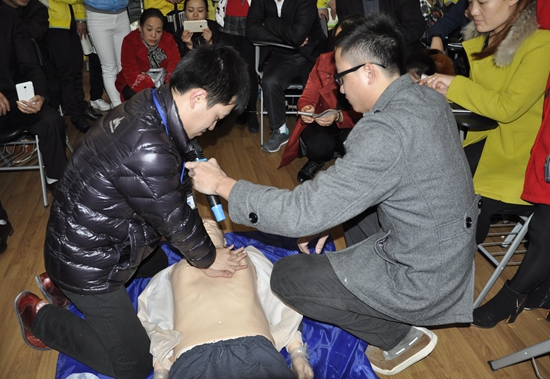 陈医师和韦医师为现场学员示范胸外心脏按压,并即场讲解相关注意事项及细节。