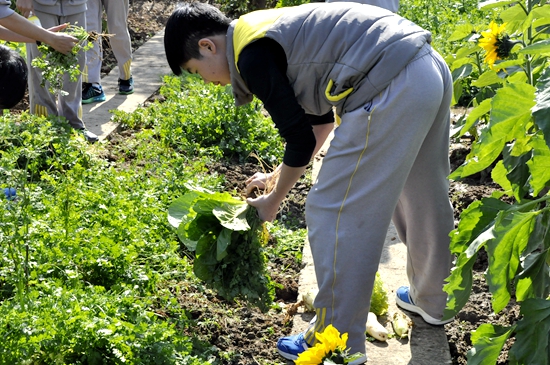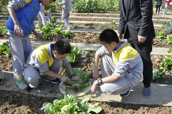 学生亲手为新鲜“出土”的果蔬去除泥污根茎。