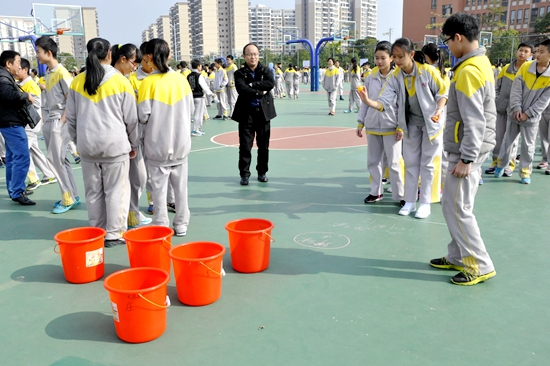 同学头顶篮球,在学生和校长的紧张注视下稳稳地迈开步伐。