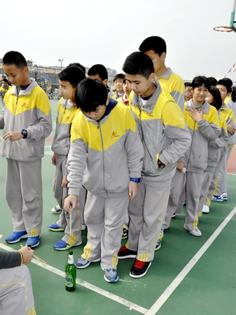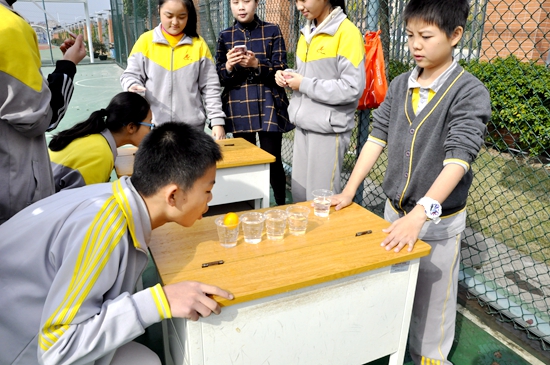 筷子能不能顺利穿过瓶口落入小小的酒瓶中?小小的游戏竟引起学生的紧张。