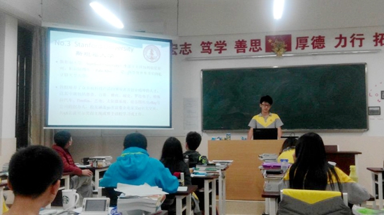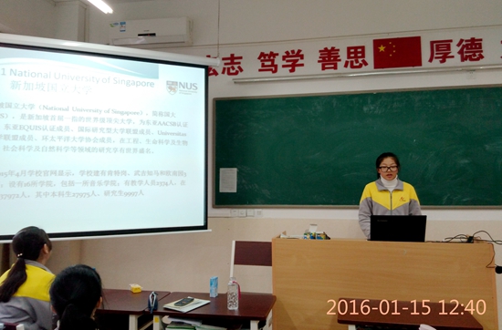 这次班会,不仅是一次了解名校的机会,更是一次公共演讲的训练,同学们根据各大数据库和学校官网的资料,用英文全方位介绍自己选择推广的学校,包括其历史、文化、院系、入学要求等信息,一场场精彩丰富的英文演讲为在场的学生听众勾画出梦想的蓝图,也提醒同学们走好当下的每一步,为圆梦打下坚实基础。