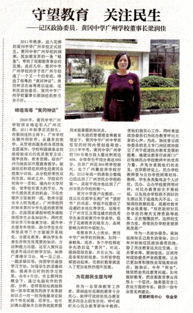 2011年秋季,进入花都的广州市黄广中学学广州学校的到来,犹如教育界的一条“鲶鱼”,带动了花都教育事业的发展。此后几年,广州市黄广中学造了一个又一个的奇迹,缔造了南粤的“黄广神话”。黄广神话在南粤得以延续,这和区政协委员、广州市黄广中学力分不开。