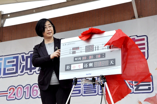 在师生的注目下,范小星校长揭开了“中考倒计时牌”的红纱,并向每个班级班主任和学生代表颁发倒计时牌。